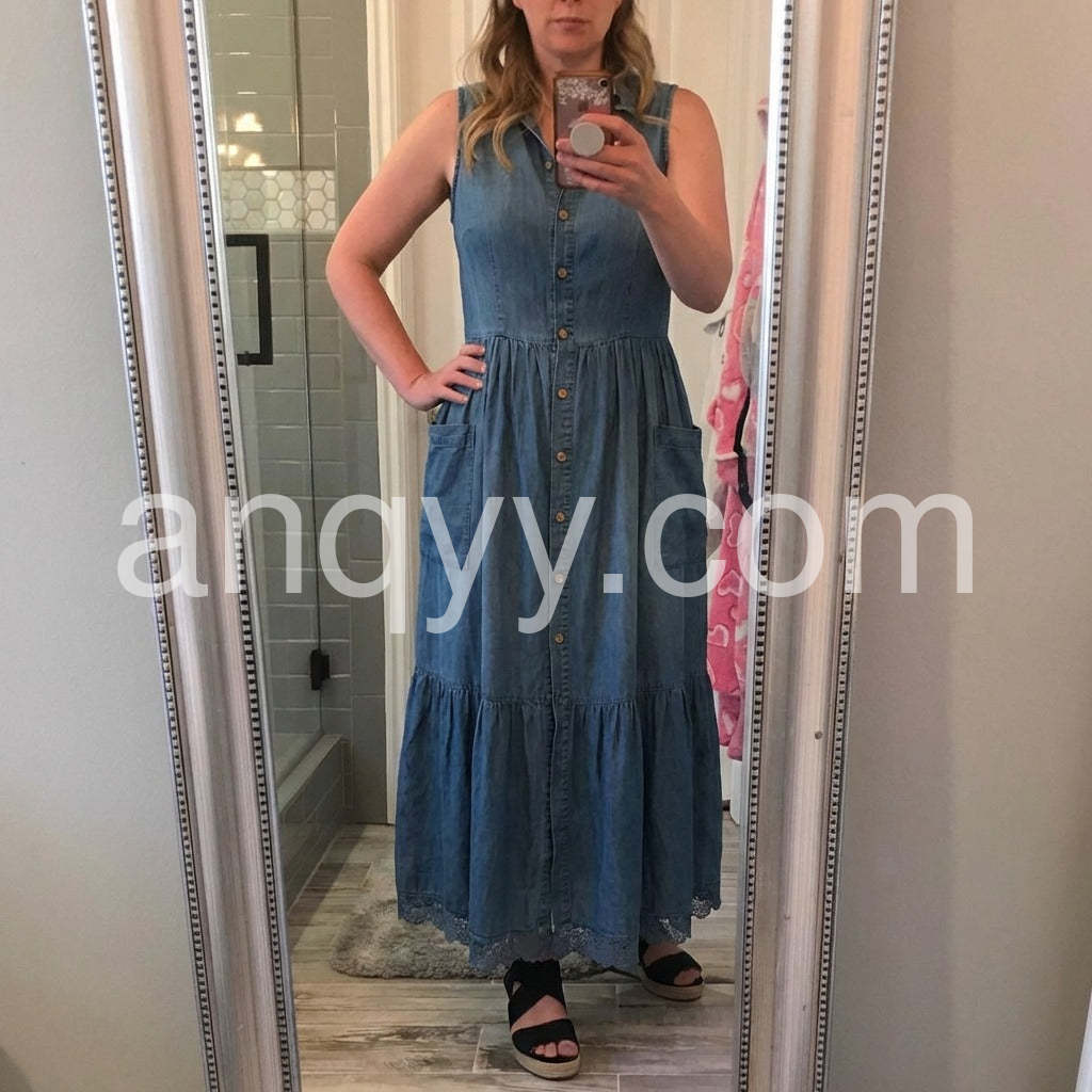 Crafted from premium denim, this sleeveless maxi dress combines timeless style with modern versatility. The flattering V-neckline and button-front closure create a refined silhouette that transitions effortlessly from casual daytime wear to evening occasions. The full-length cut offers elegant coverage while the structured denim fabric ensures durability and shape retention. Perfect for layering with jackets or cardigans, this wardrobe essential delivers both comfort and sophisticated appeal.