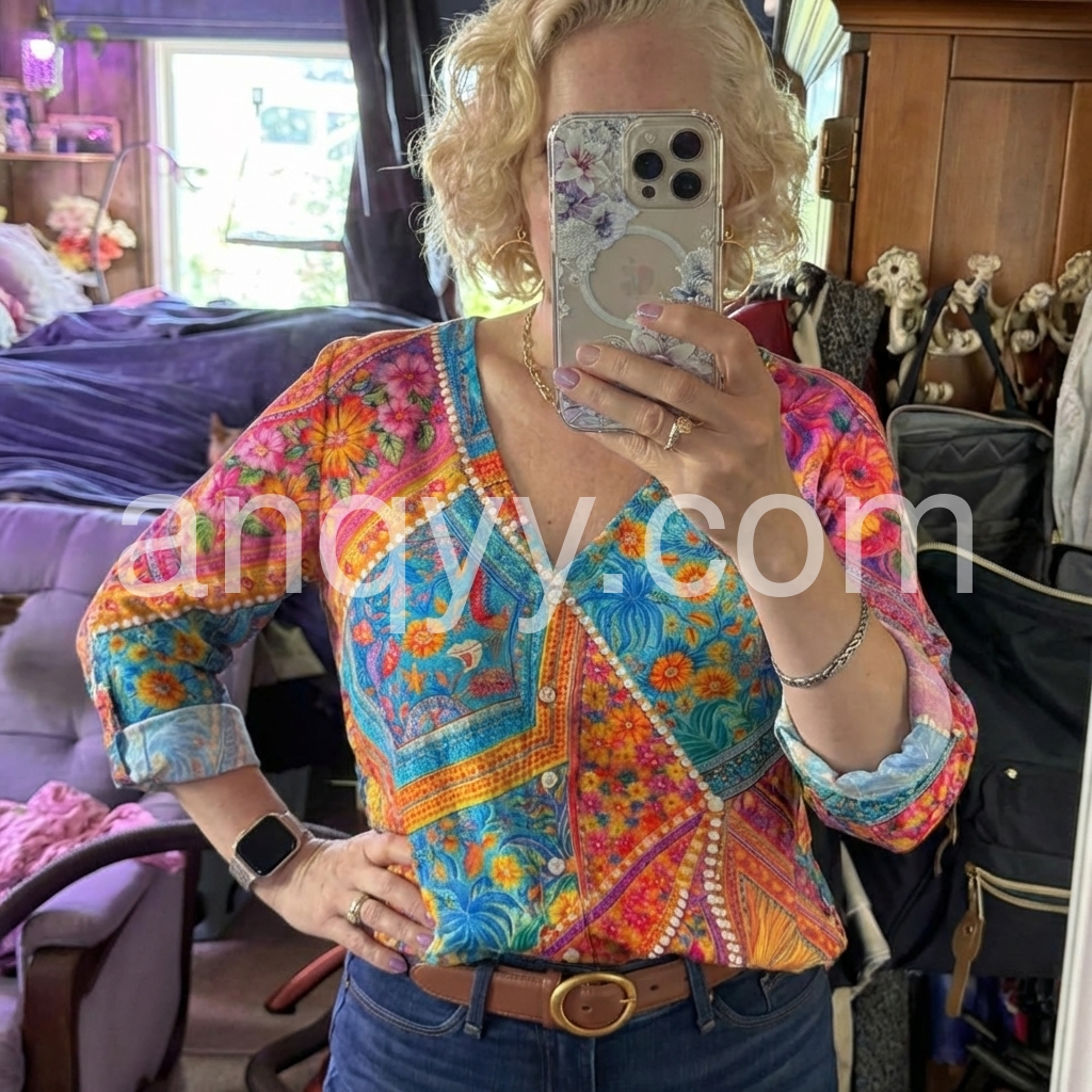 This boho-inspired top features a bold, multi-colored floral and geometric print with rich blues, pinks, yellows, and oranges. The V-neck design and front button closure add a classic touch to the vibrant pattern. Three-quarter sleeves with rolled cuffs offer a relaxed fit. Perfect for casual outings, beach days, or festival wear. Lightweight fabric ensures comfort and effortless style.