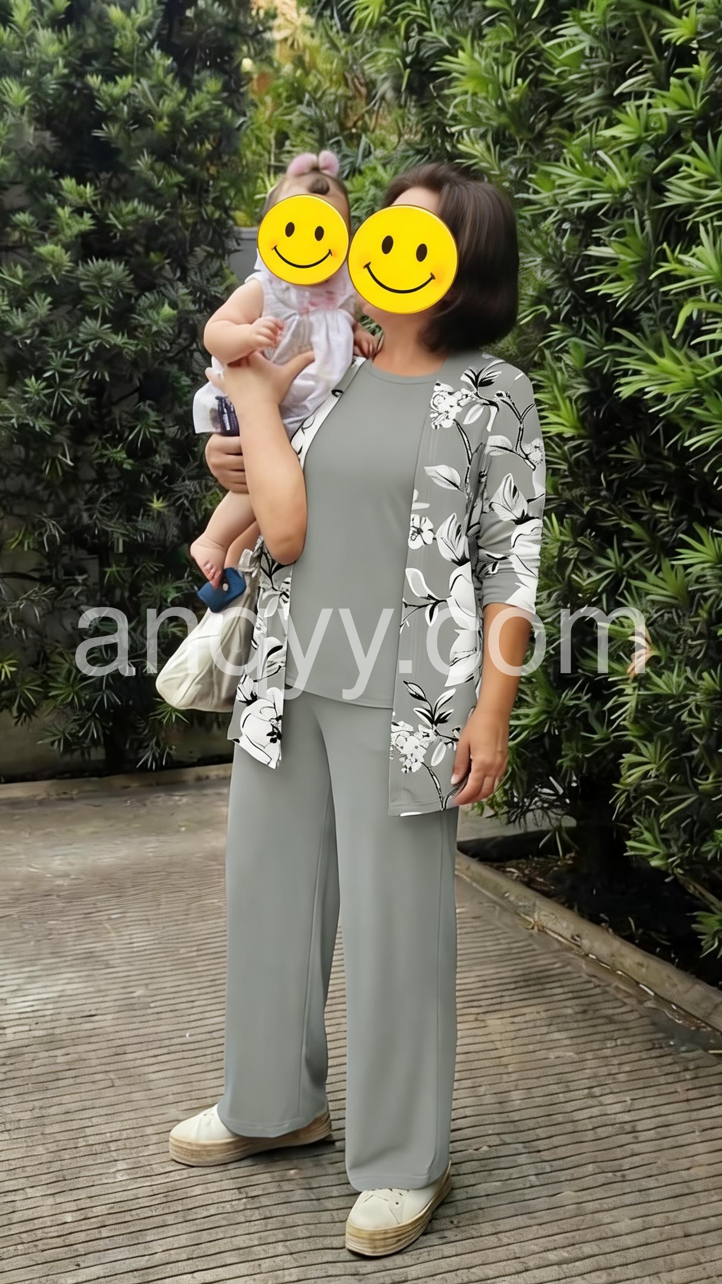 This coordinated set features a floral-print blazer with solid gray pants and a matching top. The relaxed fit offers comfort and style. Lightweight fabric perfect for casual or office wear. Ideal for creating a polished, put-together look. Sophisticated and effortlessly chic.
