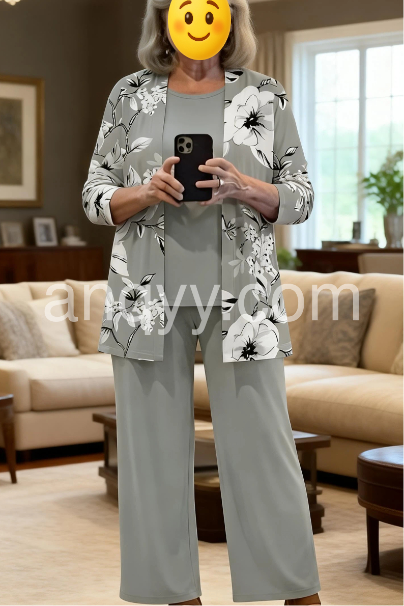 Grey Floral Print Three Piece Set