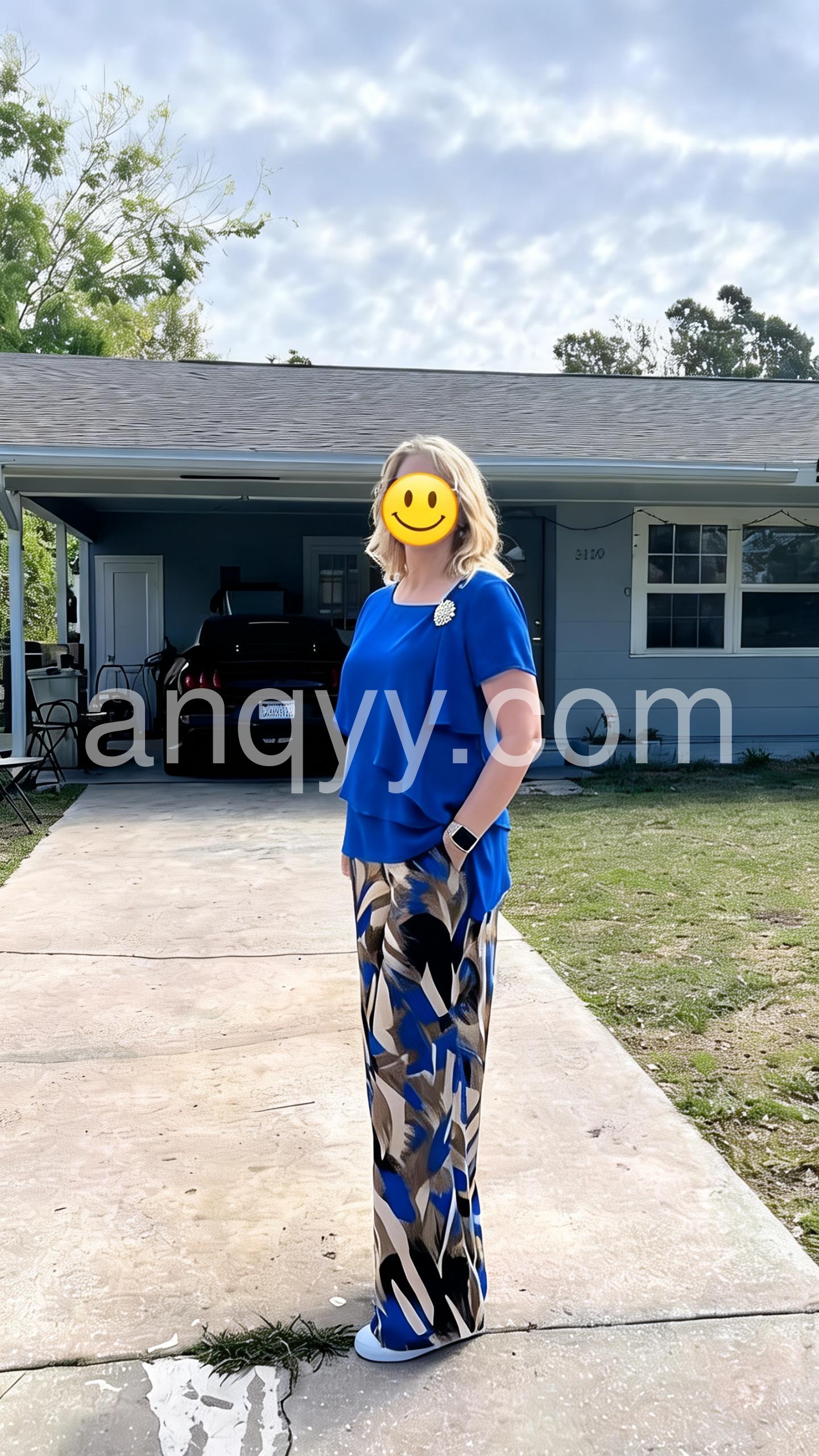 This coordinated set features a vibrant blue top with an asymmetrical layered hem and matching wide-leg pants in a bold abstract print. The combination of solid and patterned pieces creates a stylish contrast. Lightweight fabric perfect for warm weather. Ideal for casual outings or relaxed elegance. Effortlessly chic and fashion-forward.