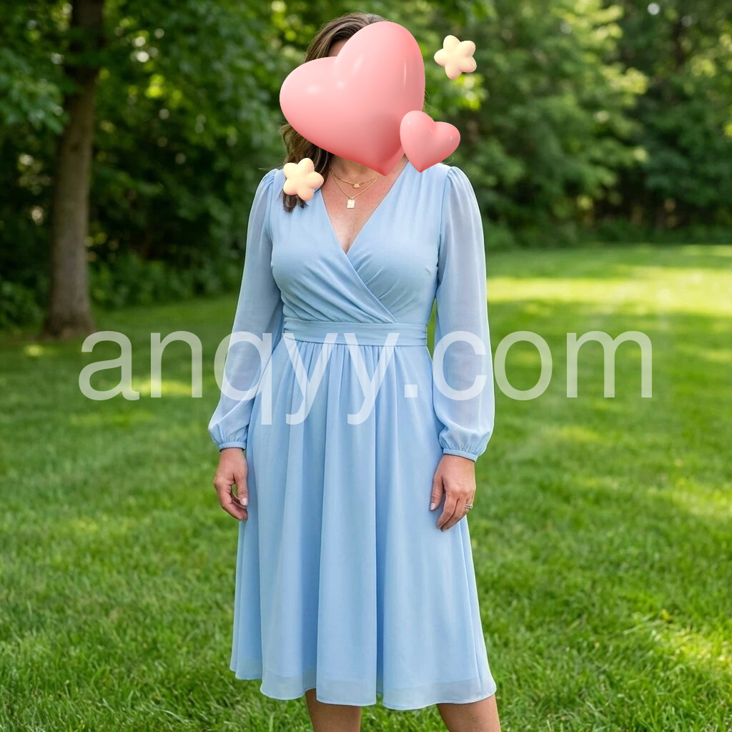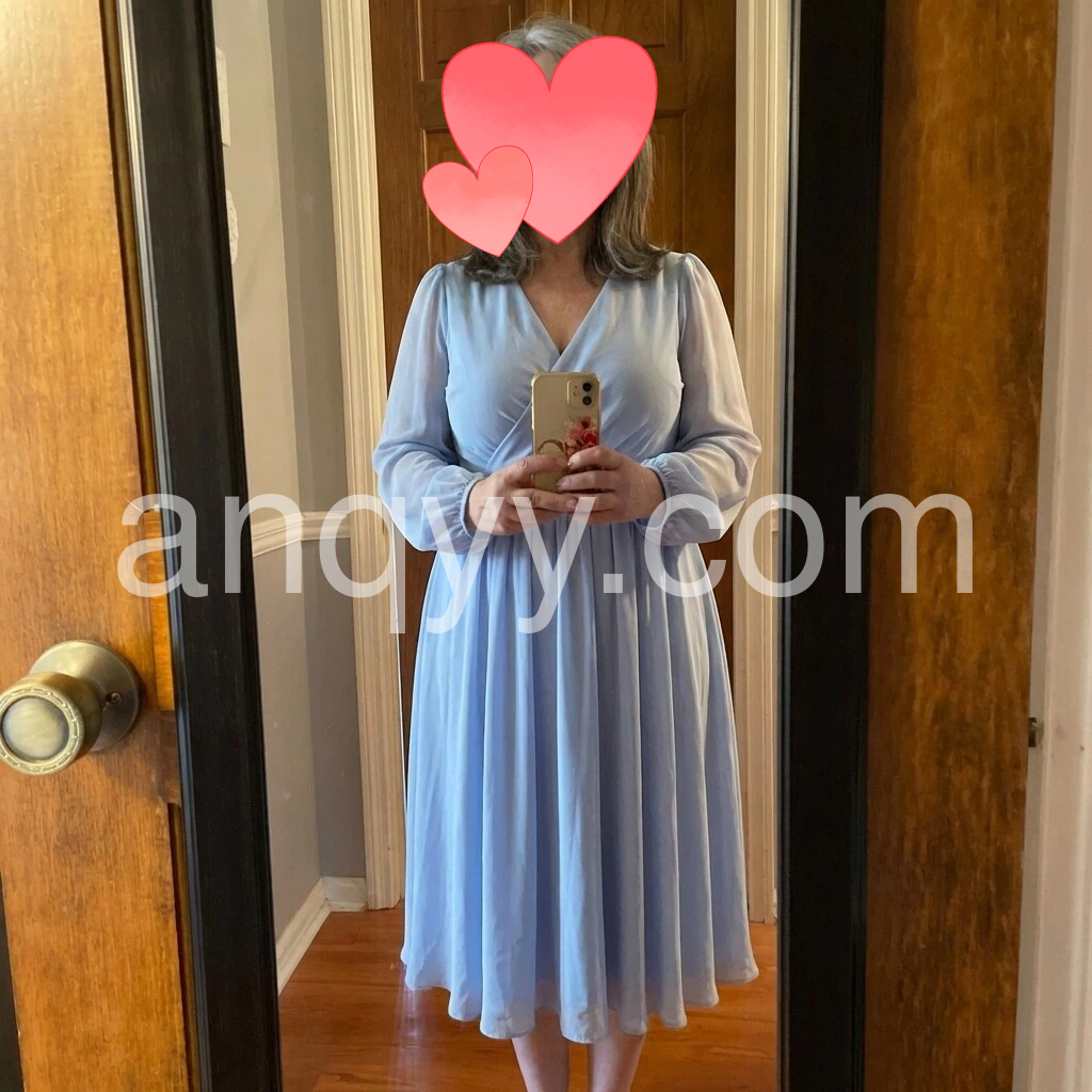 This dress is absolutely beautiful! The light blue color is so pretty and it looks very flattering. I love the V-neck and the long sleeves with a gentle puff—everything feels balanced and elegant. The fabric looks soft and breathable, and the skirt has a nice flow that doesn’t cling. It’s perfect for outdoor days and looks exactly like the photos. Highly recommend!