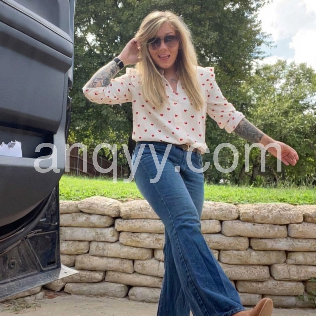 Take this lightweight red heart blouse anywhere with its fitted leg o’ mutton long sleeves with flared ruffles on the shoulders. The plunging fold-over v-neckline and fitted silhouette can be paired with high-waisted denim, slacks, or shorts. Finish your look with casual sneakers, sandals, and so much more. Wash in gentle or delicate cycle with light colors. Keep away from dark colors. The delicate fabric may absorb dark colors.