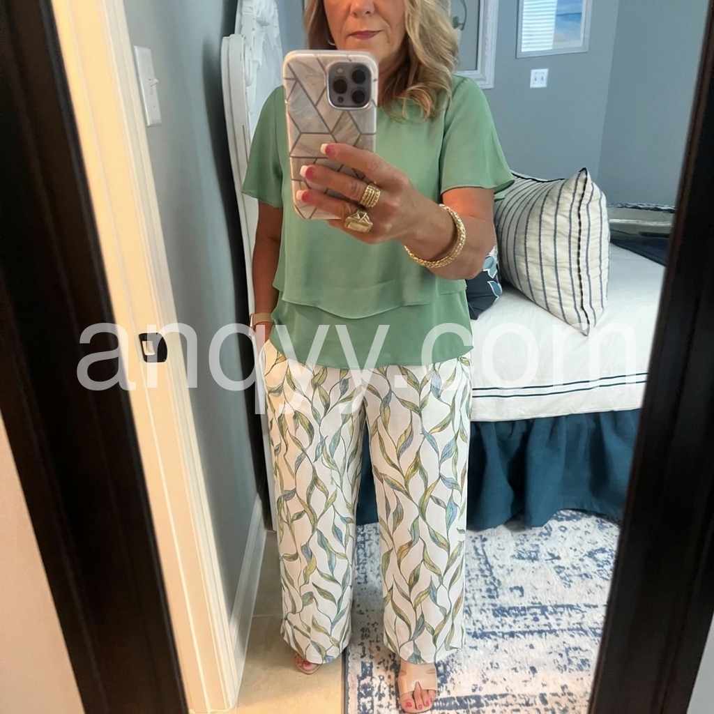 This two-piece outfit features a flowy green layered top with batwing sleeves. Paired with wide-leg pants in a soft leaf print. Lightweight and breathable fabric for all-day comfort. Perfect for casual outings or stylish everyday wear. Effortlessly chic and flattering.