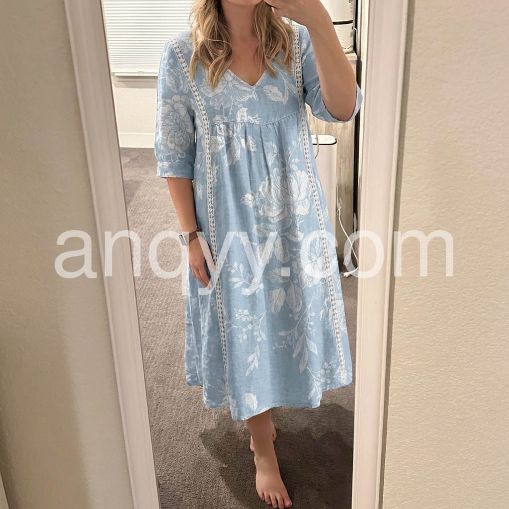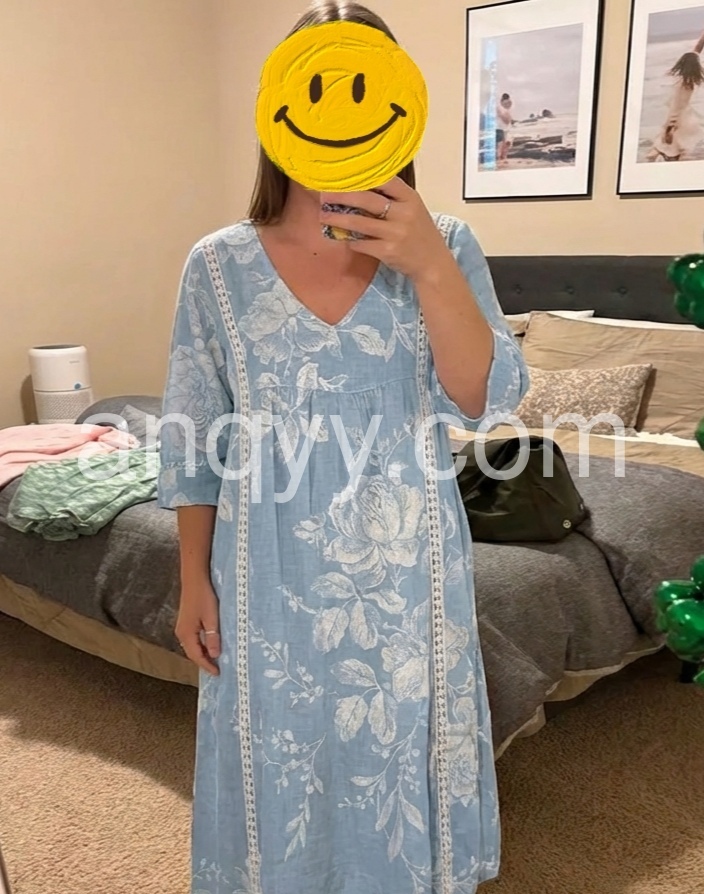 I absolutely love this dress! The light blue color is so pretty for spring, and the white floral pattern gives it a great boho vibe. Best part? It has pockets! The fit is loose and very forgiving, making it incredibly comfortable for all-day wear.