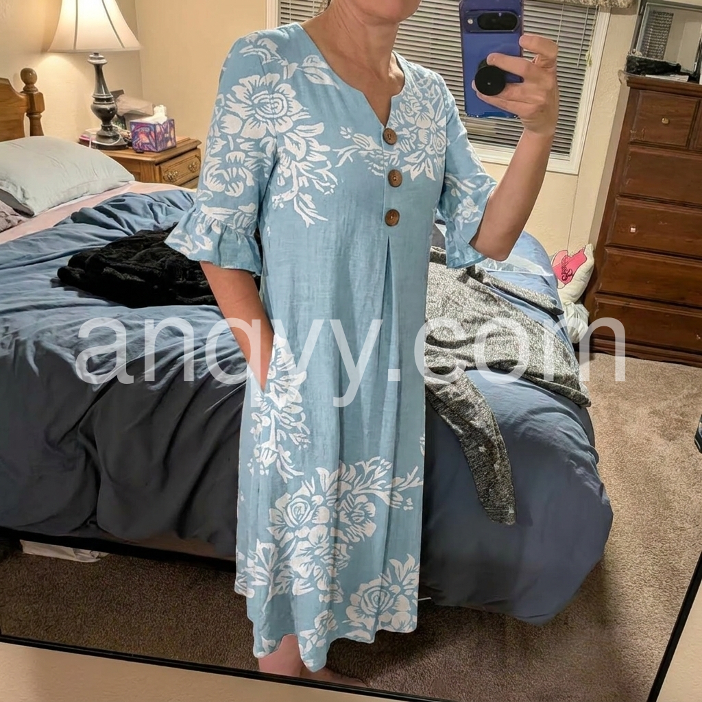 Blue Floral Ruffle Sleeve Button Linen Maxi Dress