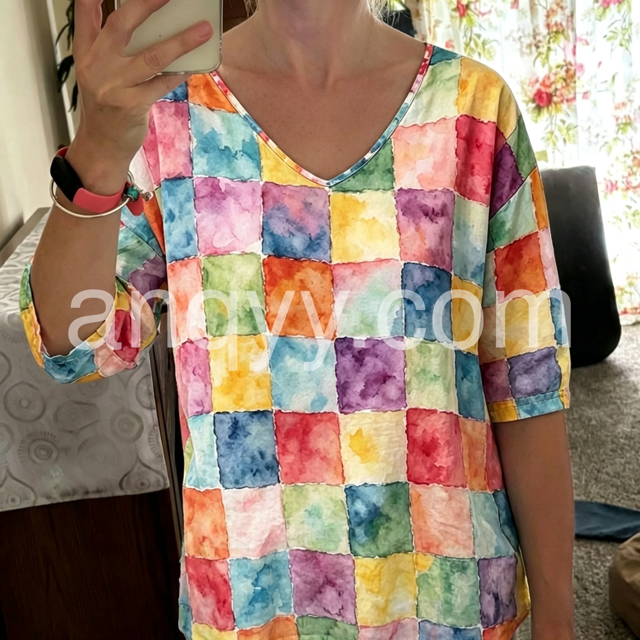 Watercolor Checkerboard Dolman Sleeve V-Neck Top