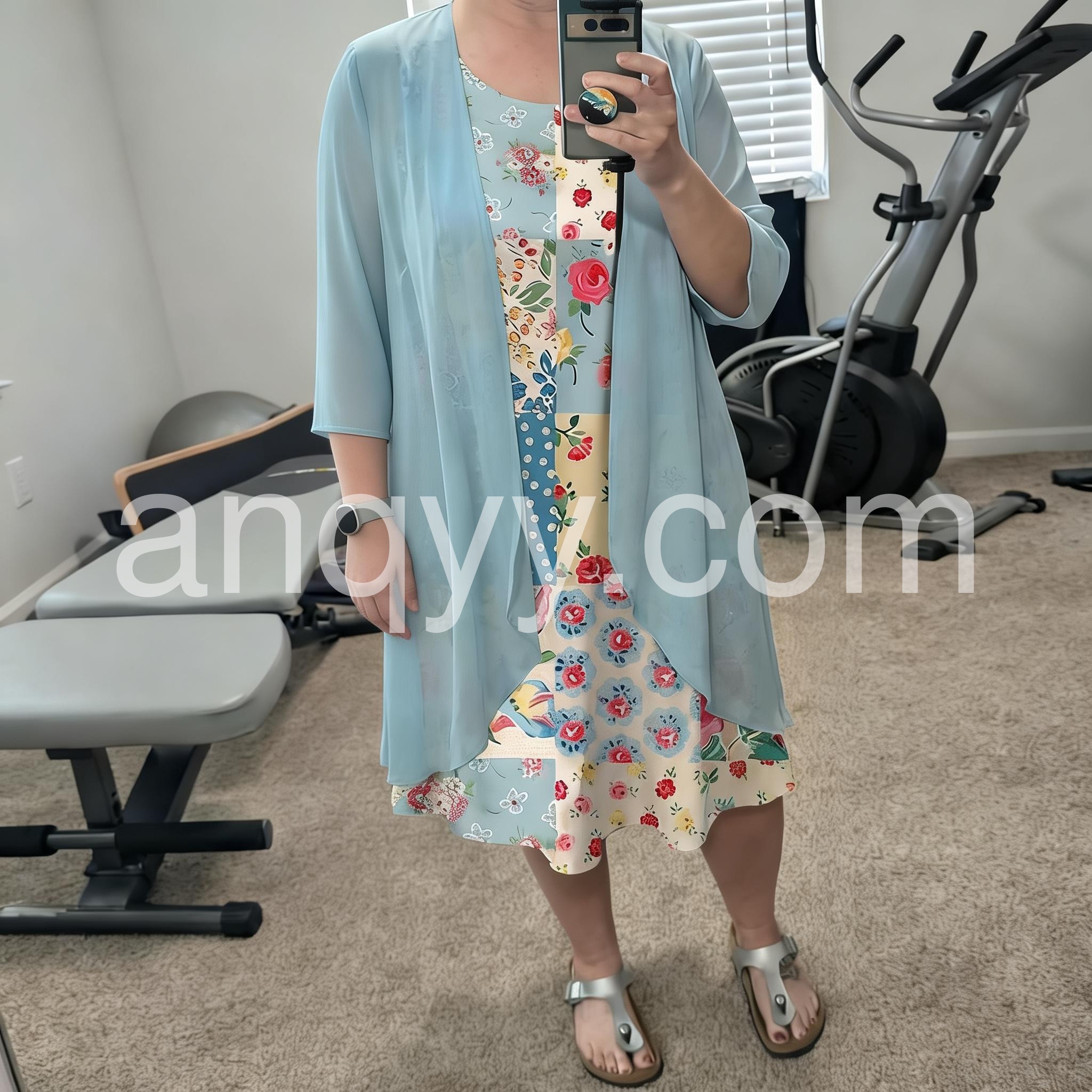 This colorful dress features a patchwork design with floral and polka dot patterns. Paired with a flowing light blue jacket for a layered look. Lightweight and perfect for spring or summer days. Ideal for casual outings or garden events. Stylish and full of charm.