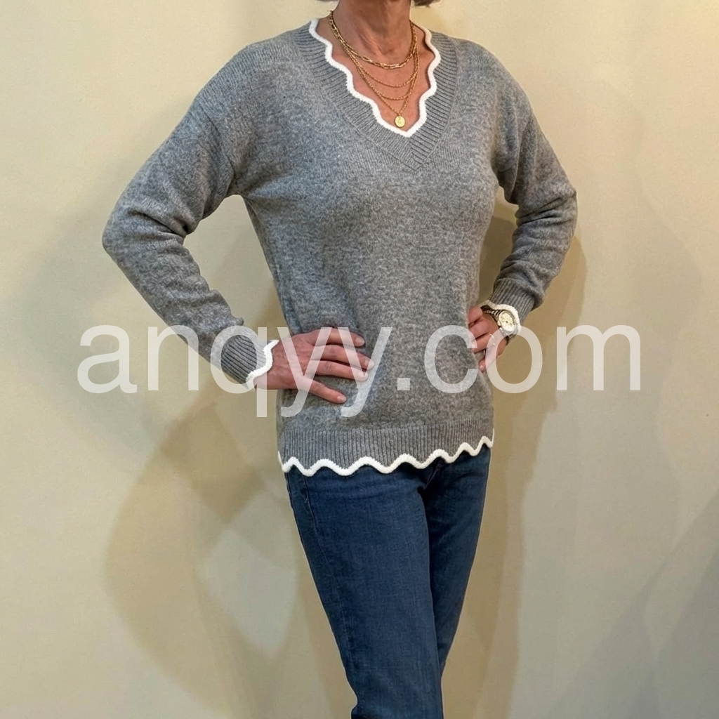 I absolutely love this sweater—it's so soft and comfortable, and the V-neck design looks flattering on everyone. The ribbed cuffs and hem with the little contrast trim add such a cute, polished touch. I’ve already worn it multiple times and it still looks great!