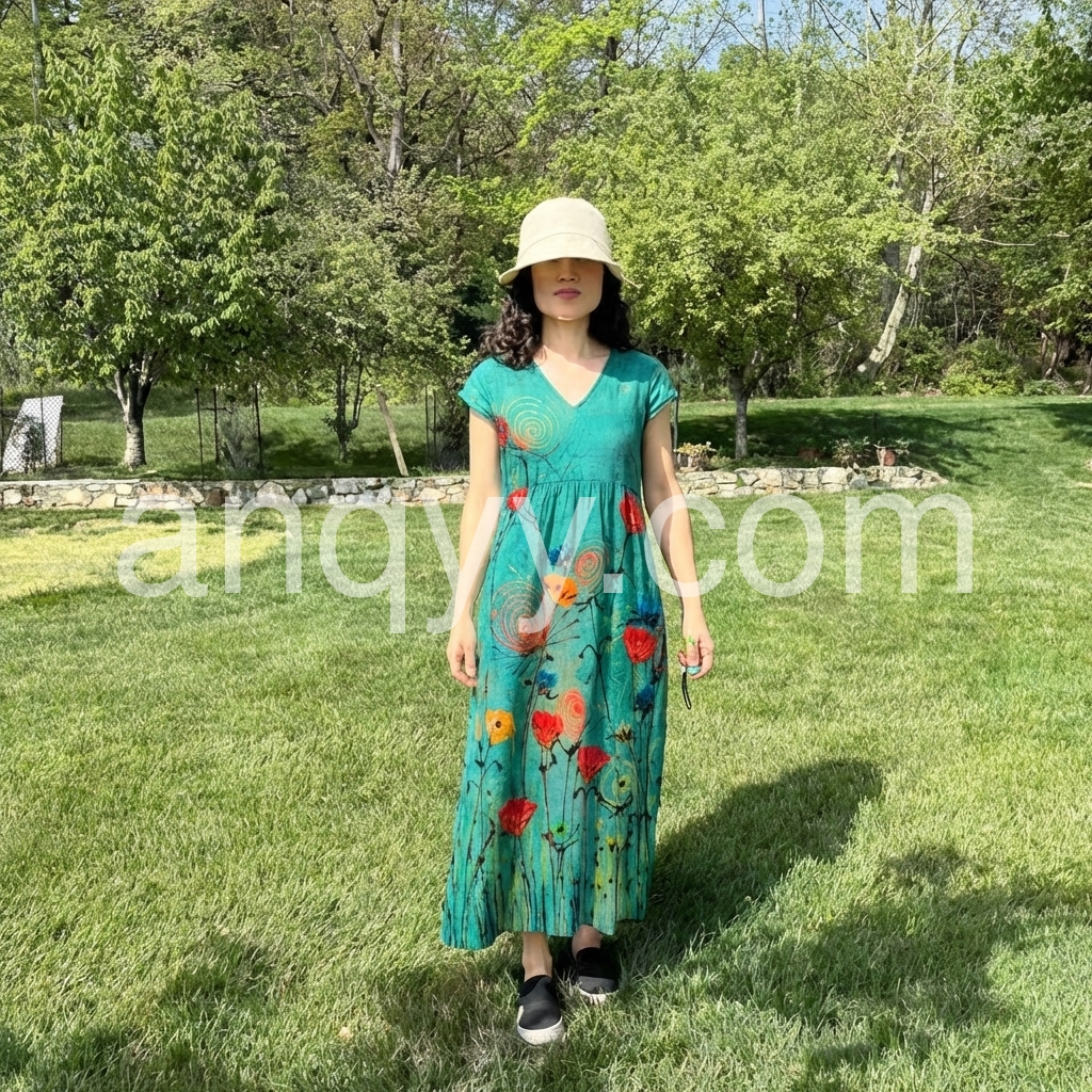Channel bohemian vibes with this stunning teal maxi dress. It showcases vibrant, artistic floral prints with swirling details, making it a true work of art.