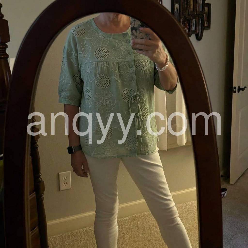 Created to refresh everyday basics, this embroidered blouse solves the problem of “boring work tops” with delicate floral cutwork. The intricate embroidery adds texture and visual interest, elevating simple jeans or trousers.