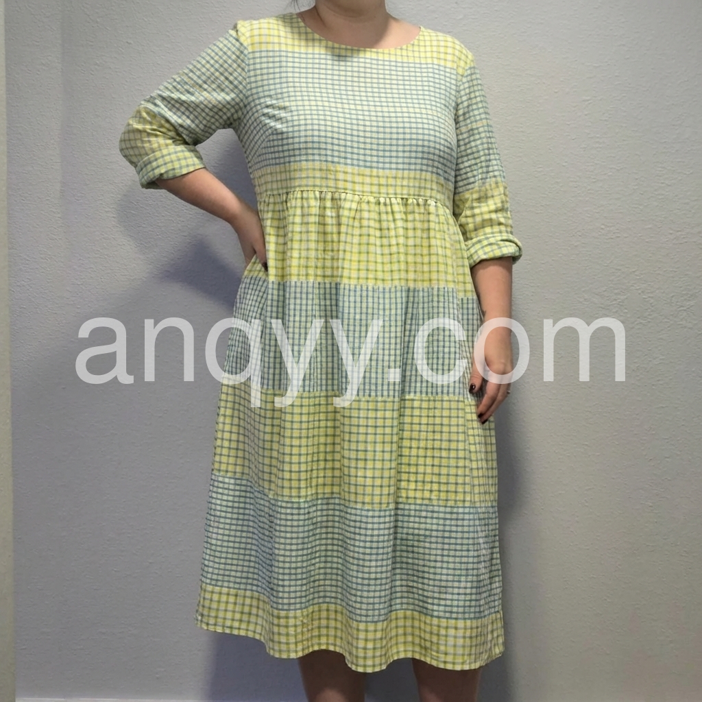 This midi dress celebrates effortless summer style with a playful color-block gingham design. The round neck, 3/4 sleeves, and tiered skirt offer a relaxed, flowy fit.