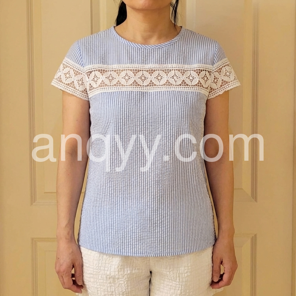 This short-sleeve top features a delicate white lace panel across the chest and sleeves. Made from soft, textured fabric with vertical stripes for a subtle pattern. Perfect for casual summer days or beach outings. Pair with shorts or jeans for a stylish look. Effortlessly chic and breathable.