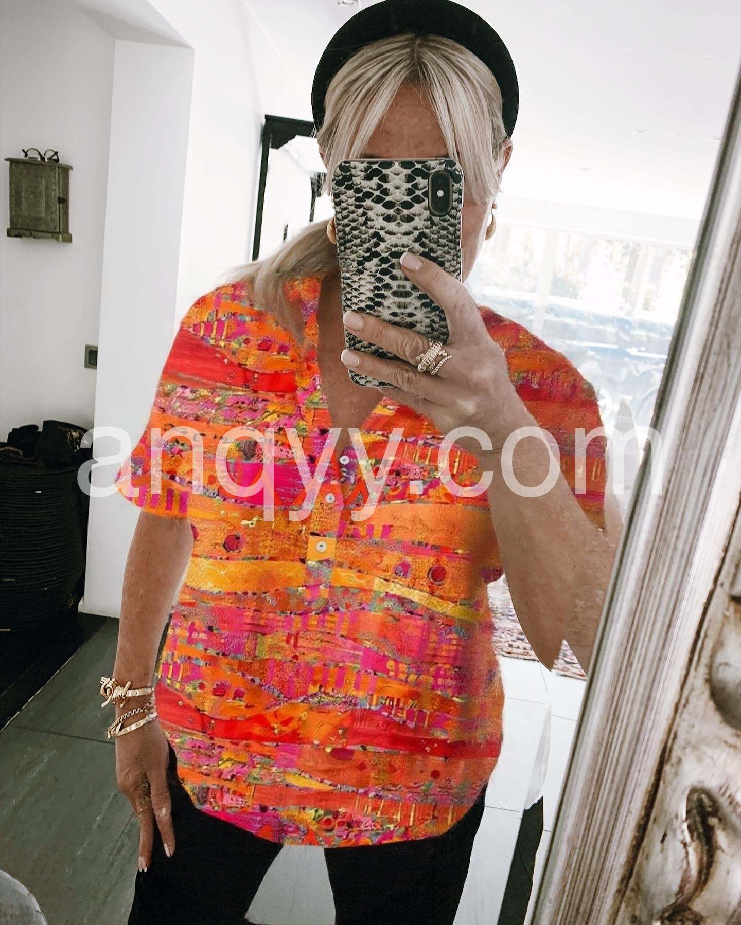 The star of the show is its eye-catching abstract print, featuring a dynamic interplay of bold orange, fiery red, and soft pink hues, reminiscent of a sunset or a modern painting. The relaxed, loose-fitting silhouette ensures all-day comfort, while the classic V-neckline and front button closure add a touch of timeless style.