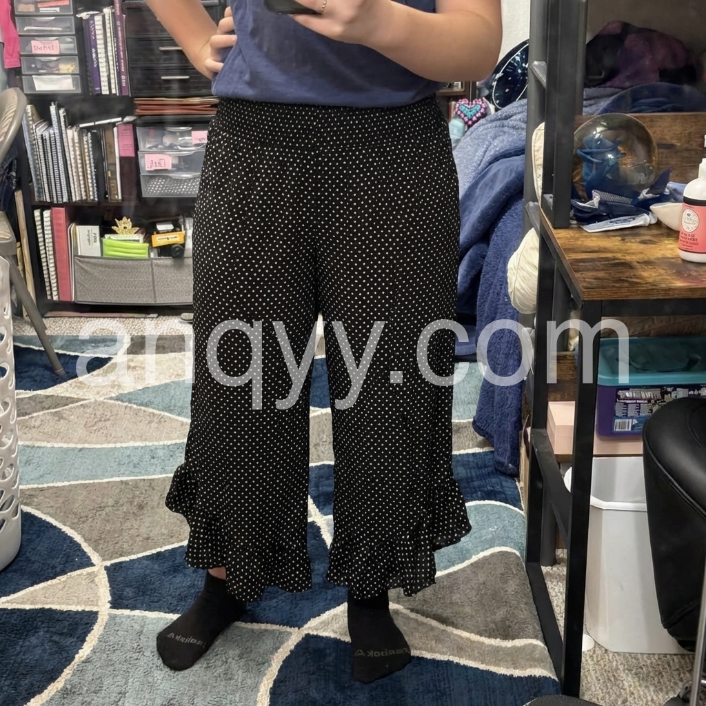 These high-waisted culottes feature a black base with tiny white polka dots. Wide-leg design with ruffled hem for a soft, flared look. Lightweight fabric perfect for warm weather. Ideal for casual outings or relaxed styles. Comfortable and effortlessly chic.