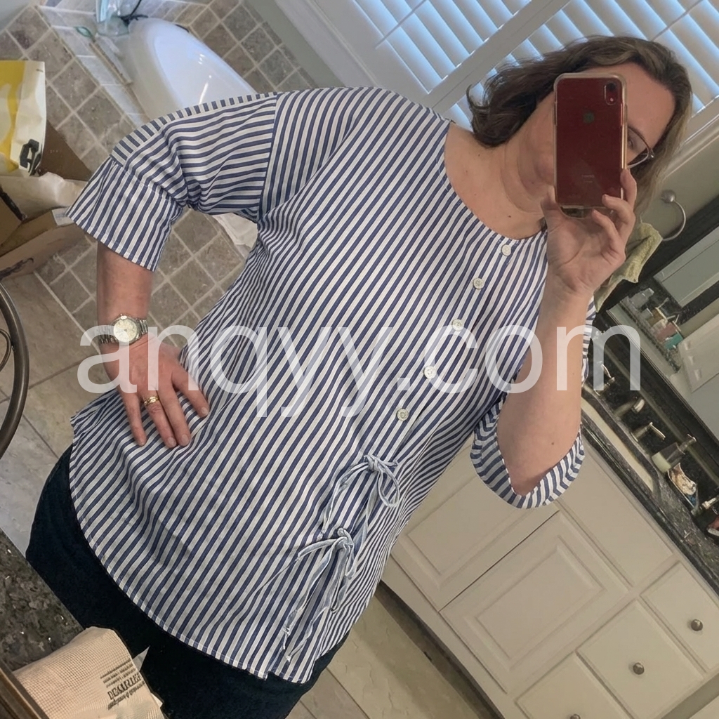 This loose-fit top features vertical blue and white stripes with a clean, casual look. Round neckline and front button-down design for easy wear. Side ties add a feminine touch. Three-quarter sleeves with rolled cuffs. Perfect for everyday comfort and effortless style.
