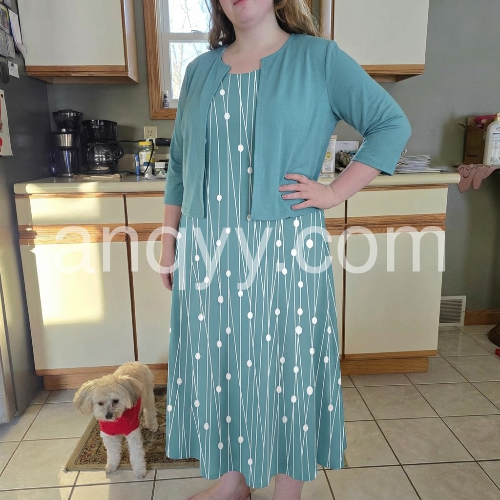 This flowing midi dress with white polka dots on a turquoise background. Paired with a matching short sleeve jacket for a polished look. Comfortable and stylish for casual outings or garden events. Lightweight fabric perfect for warm days. Effortlessly chic and feminine.