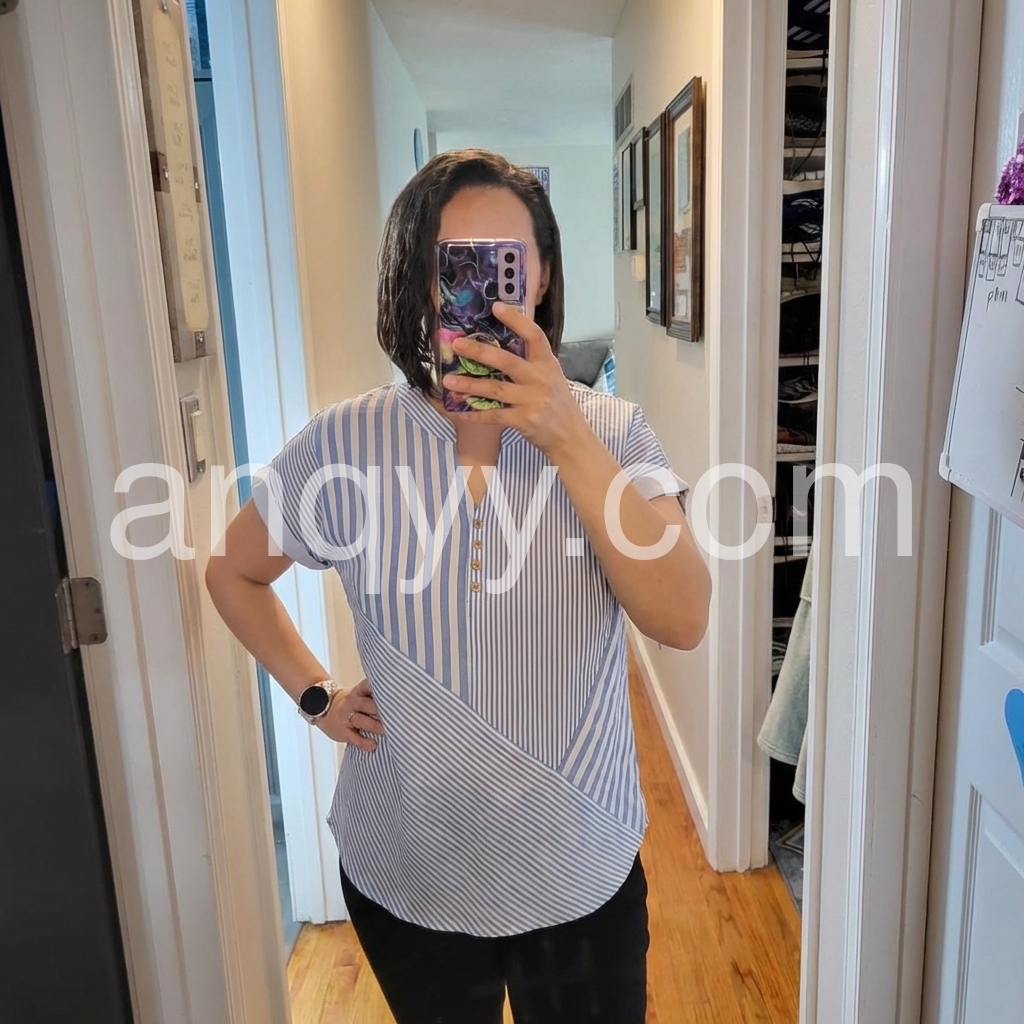 This short-sleeve top features vertical blue and white stripes. V-neckline with front buttons and a stylish wrap design. Cuffed sleeves add a polished touch. Lightweight and perfect for casual wear. Ideal paired with jeans or trousers.