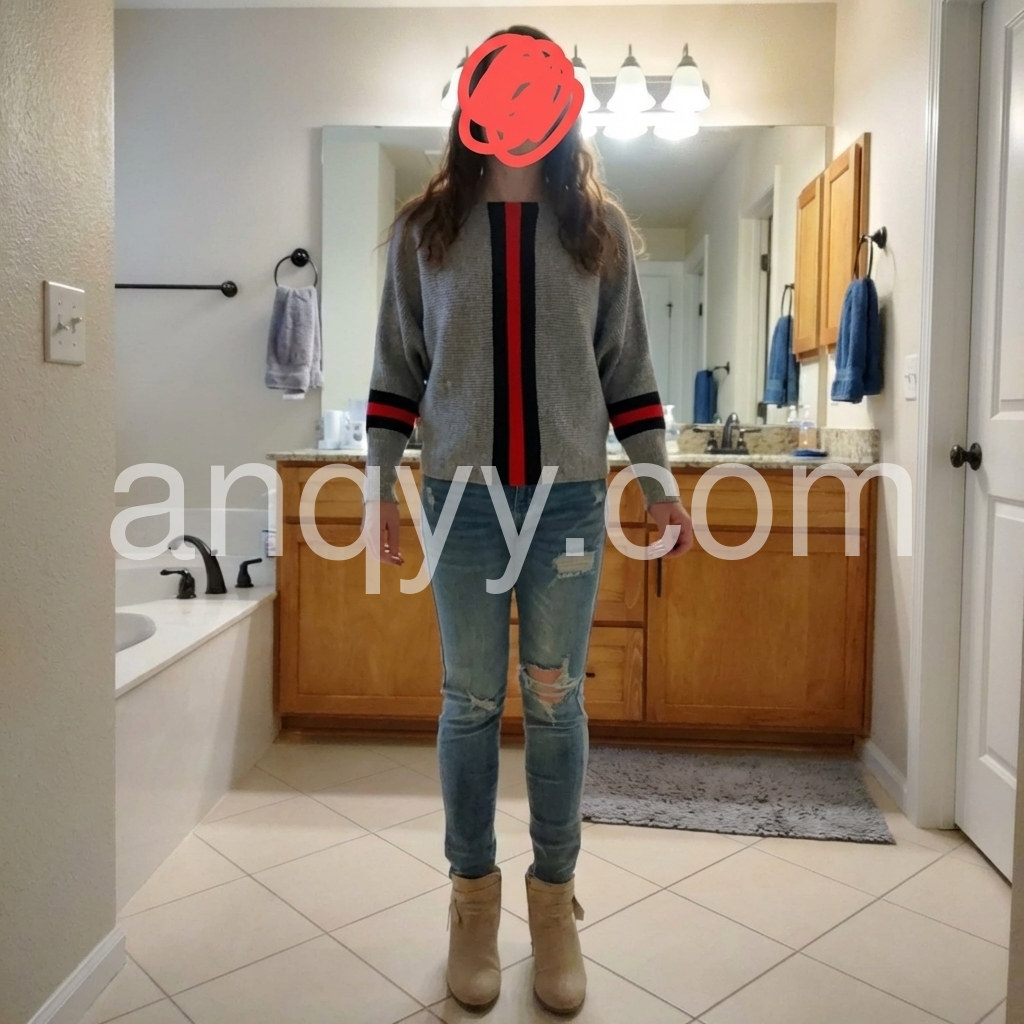 Bold designer-inspired red and black stripes down the front and on the long Dolman sleeves give this classic gray sweater an elevated look. Wear this versatile and comfortable little sweater to just about anywhere for a refined, laid-back style. Pair with black leggings, pants, and boots. Machine wash normal with light colors or hand wash. Bleach if needed. May be hung up to dry or lay flat. Tumble dry with low heat. Light ironing if needed.