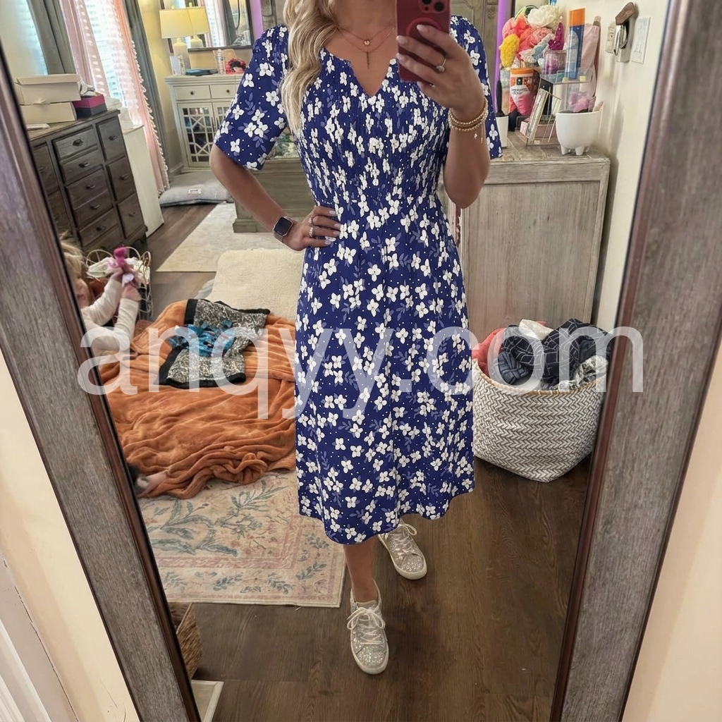 This dress solves the “cute but comfortable” dilemma with ease. The ditsy white floral print on a navy base feels fresh and summery, while the smocked waist creates a flattering silhouette. The gathered detail cinches the waist without feeling tight.
