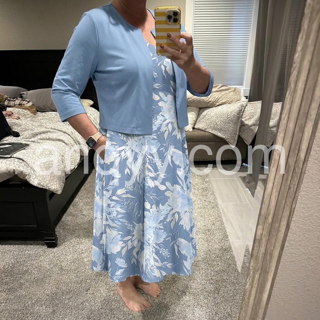 This dress features a flowing midi length with soft blue floral print. Paired with a matching short sleeve jacket for a polished look. V-neckline and side pockets add comfort and style. Lightweight fabric perfect for warm days. Ideal for casual outings or garden events.