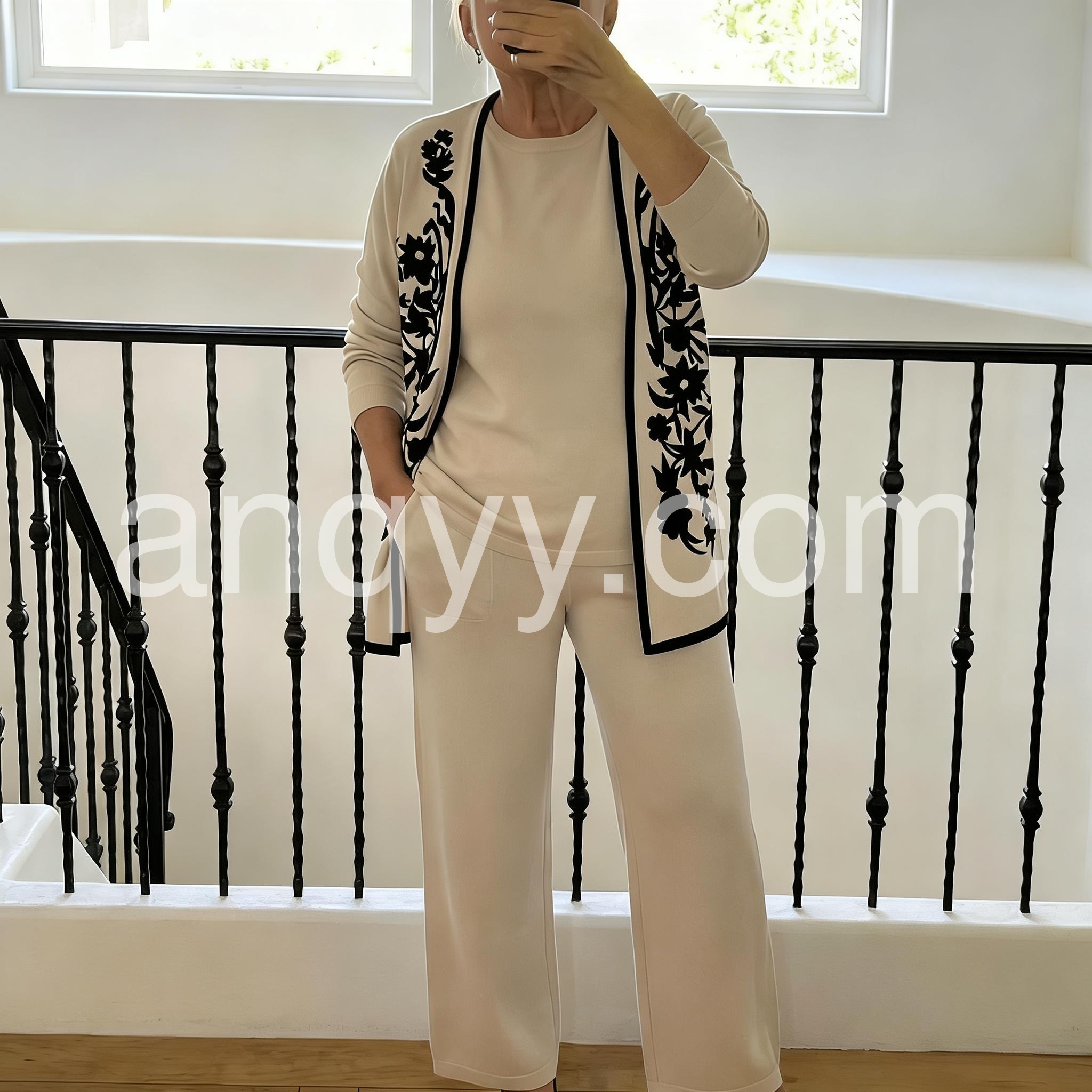 This coordinated three-piece set features a soft beige top, wide-leg pants, and an open-front cardigan with black floral embroidery. The clean lines and subtle contrast create a refined look. Perfect for casual outings or relaxed elegance. Comfortable, stylish, and effortlessly chic.