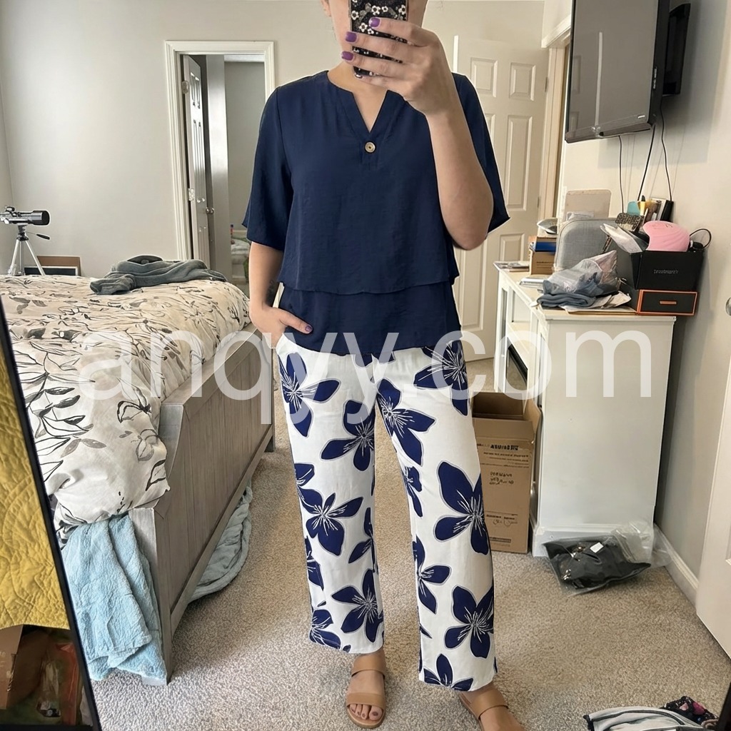 This coordinated set features a relaxed navy top with a layered hem and a single-button detail. Paired with white pants in bold navy floral prints for a beach-ready look. Lightweight fabric perfect for warm weather. Ideal for resort wear or casual outings. Effortlessly elegant and easy to style.
