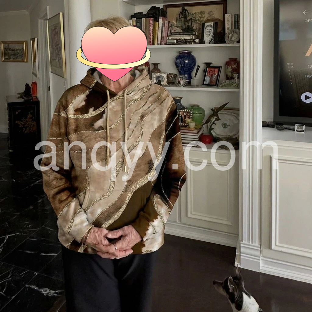 This hoodie is stunning! The fabric has a soft, velvety look, and the gold detailing gives it a really elegant, dressy feel. The drawstring hood and relaxed fit are comfortable, and the length is flattering when paired with jeans or leggings. It looks exactly like the photos and is perfect for holiday casual glam outfits. I’ve worn it a few times already and it still looks great.