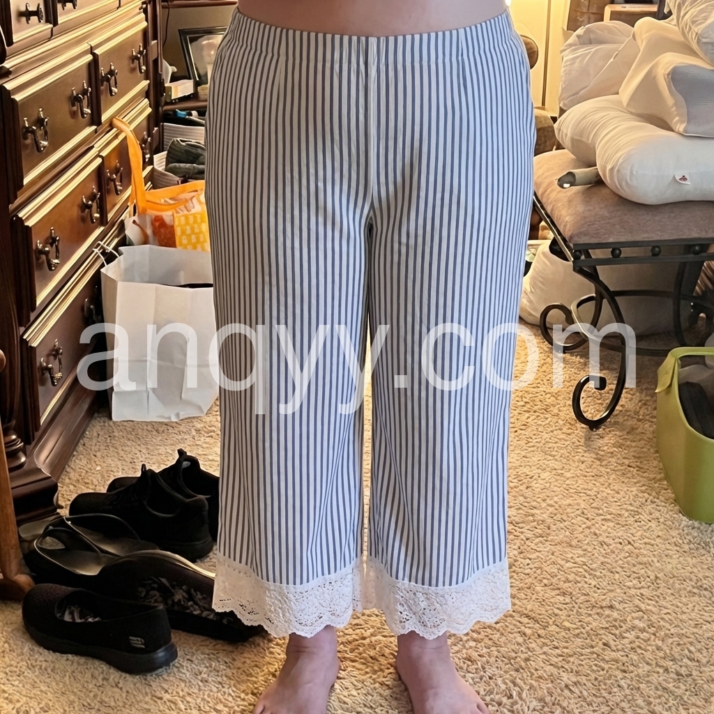 These relaxed-fit pants feature vertical blue and white stripes with a delicate lace trim at the hem. Elastic waistband and side pockets for comfort. Lightweight fabric perfect for warm weather. Ideal for beach days or casual outings. Effortlessly stylish and breezy.