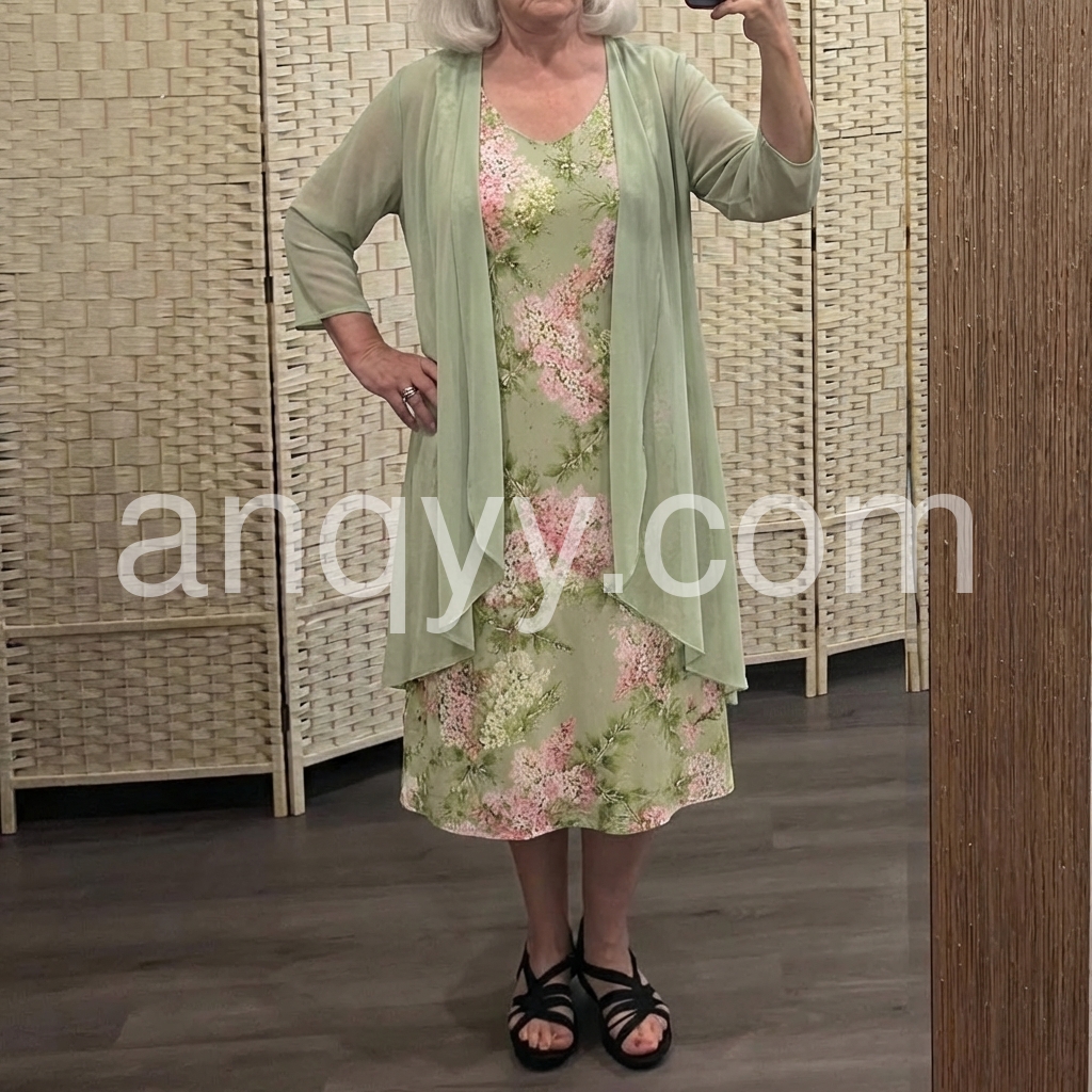 This soft floral dress features a light green base with pink and white blossoms. Paired with a matching sheer duster for a layered look. V-neckline and relaxed fit perfect for warm days. Ideal for garden parties or casual outings. Fresh and feminine style.